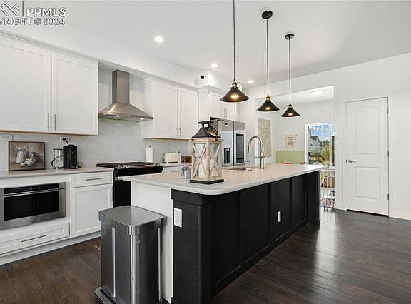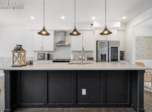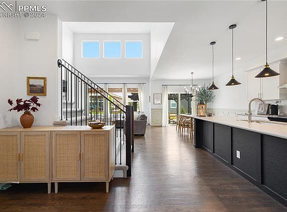 Welcome to this well appointed Wolf Ranch home within the D20 school district that boasts Pikes Peak views and space galore. As soon as you enter the home, you feel a sense of 'being home' with its soaring great room and stylish kitchen. Upgraded hardwood floors grace the main level, and provide a sense of flow and continuity as you explore the different spaces offered such as the gourmet kitchen with a connecting flex room, dining area, and welcoming living area with an upgraded fireplace with stone masonry. There's also a separate office space on the main level with a beautiful accent wall. Upstairs are four bedrooms, to include the primary bedroom and laundry room, and a secondary full bathroom. The primary bedroom is spacious with a private balcony that has prominent Pikes Peak views. The master bathroom has dual vanities, a separate shower, and gorgeous soaking tub. The basement has 9' ceilings, another bedroom, and full bathroom. Landscaping is complete with lighted stones to the front door, and an entertainer's dream of a backyard with a covered sitting area, astroturf, and fully fenced. Come see what life can be like in the Wolf Ranch community where you have access to trails, parks, a community pool, and a variety of neighborhood events.