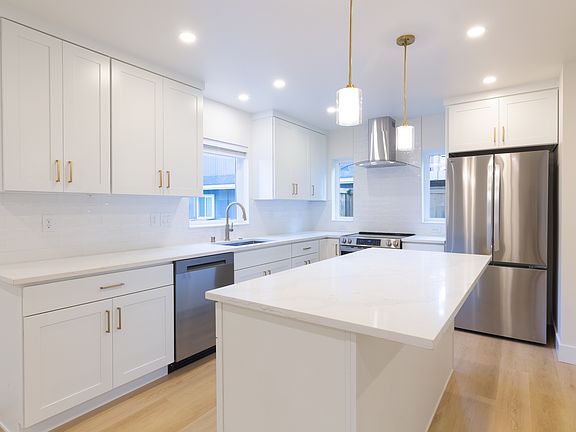 * Brand-New Kitchen: Modern white cabinetry, quartz countertops, range hood vent, large waterfall island, and stainless steel appliances