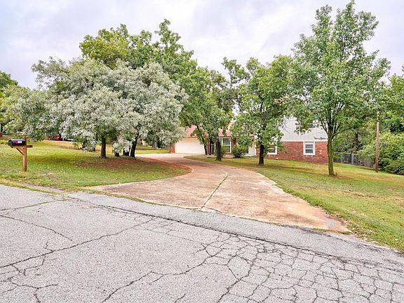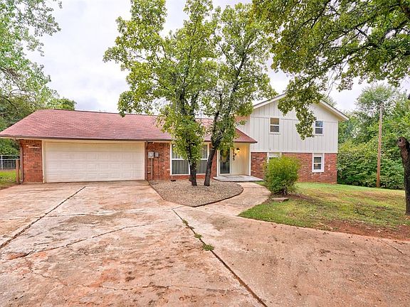Price Enhancement! Welcome to your dream home! This modern farmhouse features a tri-split floor plan with 4 bedrooms and 2.5 bathrooms. As you step inside, you'll be greeted by a formal dining area, illuminated by a large floor-to-ceiling window. Venture further to discover the heart of the home: a massive kitchen boasting a large island as the focal point, complemented by ample counter and cabinet space. Adjacent to the kitchen, a breakfast nook with a charming brick half-wall seamlessly connects to the living room situated a few steps down. Here, you can enjoy cozy nights around the fireplace. Just off the living room, discover the expansive master suite, complete with a huge walk-in closet and a spacious bathroom featuring a tiled shower. Upstairs, you'll find three additional bedrooms, built-in storage, and a large bathroom equipped with double vanities. Nestled on over an acre adorned with mature trees, this home offers a splendid pergola and patio space in the backyard, creating the perfect sanctuary for relaxation and entertainment. Don't miss the opportunity to own this beautiful home in a serene neighborhood! Conveniently located just 14 minutes from Tinker Air Force Base and 20 minutes from Downtown OKC, enjoy the perfect balance of a great location with the benefit of seclusion.