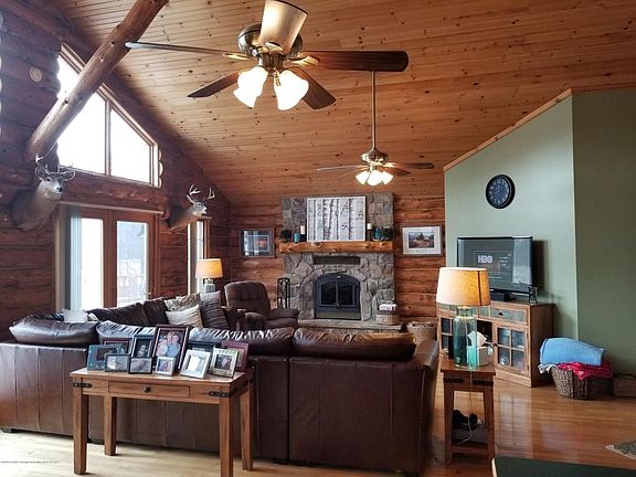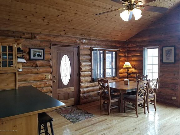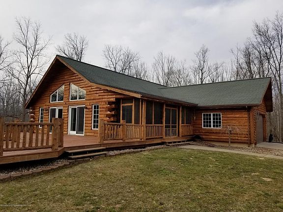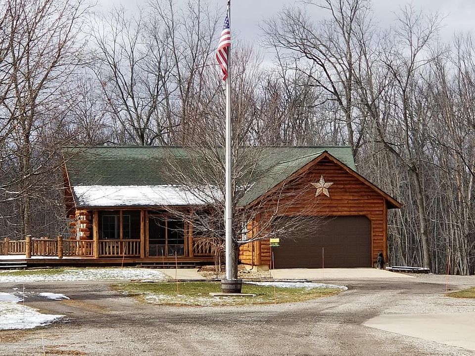 One of a kind opportunity to own 45+ acres bordering Indian Creek and Battle Creek River with stocked pond, gorgeous home and outbuildings! Log home with over 2200sqft including lower level finished walk-out!Step onto the screen porch and enter the great room with wood burning fireplace, vaulted ceilings, hardwood floors, all open to the kitchen and dining area! The expansive views of the property and wrap around deck allow you to enjoy nature at its finest! Master Bedroom and private bath aswell as 2 additional bedrooms and full bath complete the first level. Enter the lower level and enjoy the endless possibilities of entertaining with the built in wet bar and cozy booth plus extra seating designed for this home specifically! Tons of storage, 2 Car Att Garage and did we mention the outbuildings??!!! 80 x 40 Open-sided Pole Barn, 64 x 40 & 23 x 23 Pole Barn with spacious apt/living space attached, shed and 25 acres of farm land that is presently leased!