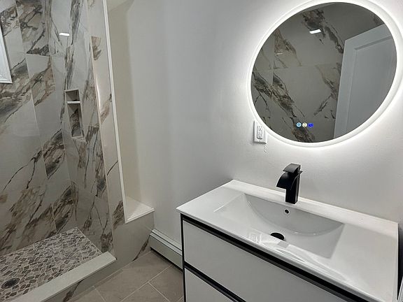 Modern bathroom tile with LED mirror, and updated doors and trim. Move-in-ready and completely refreshed.