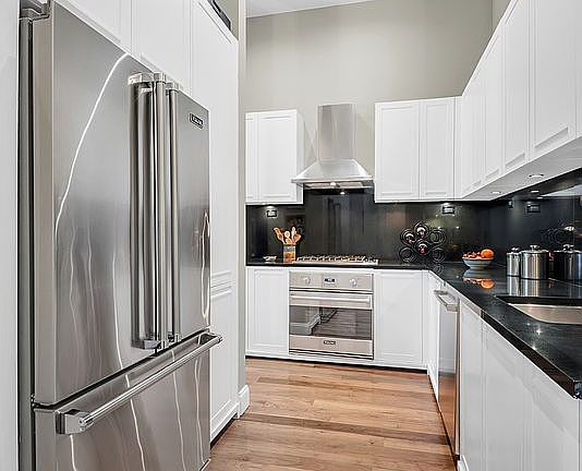 The partially open kitchen allows for ease in entertaining with abundant cabinet storage complemented by black stone counters and seamless backsplash. High-end professional appliances include Viking refrigerator and 5-burner gas range and electric oven with vented hood, Bosch dishwasher, and in-cabinet Cuisinart microwave. Convenient elements include under-counter lighting, garbage disposal and Grohe fixtures.