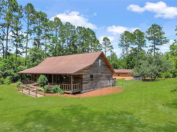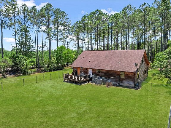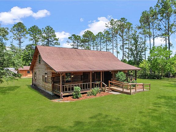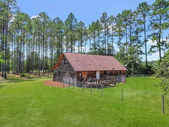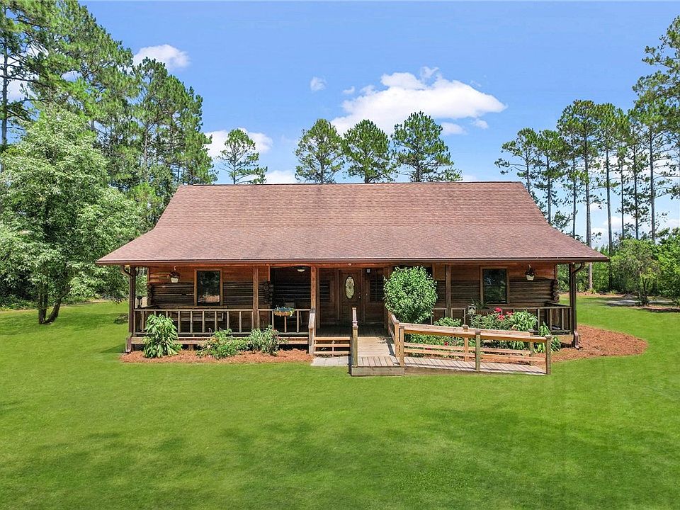 This beautiful 4 bedroom, 3 bathroom cabin is sitting behind approximately an acre of planted pines with woods behind and to the right of the house. Enjoy listening to the birds from the swing on the front porch and grilling on the back deck. This home is conveniently located close to shopping and restaurants while having the setting of a beautiful cabin in the woods. Enter the front door into an open living room/dine in kitchen and if you head to the left there is an additional room that could be used as a formal dining room or bedroom. The guest bedroom and bathroom are on the left as well. To the right you will find the main bedroom, bathroom, and laundry room. From the laundry room head upstairs to an additional bedroom/bonus room, bathroom and office/additional bedroom. The bedrooms and all upstair areas are carpeted. The bathrooms, dining room, and laundry room are tiled. The main living area has vinyl flooring. Several rooms have pine tongue and grooved wainscoating below the chair rail. This year the water heater was replaced, septic tank was pumped, and the interior of the house was painted. A new tile shower was installed in the main bathroom less than a year ago. Behind the home is a large workshop with an office that has a window unit. There is an additional utility shed and a covered shed behind the office/workshop. Listing agent is one of the owners of this home.