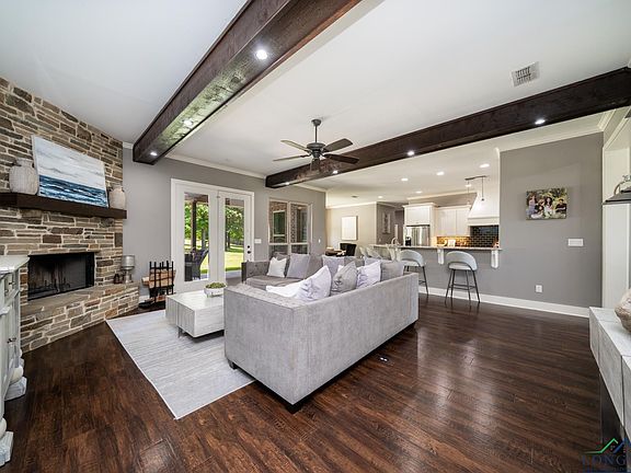 Beautiful home in gated "Timber Falls" neighborhood. Step in and enjoy the open concept living from kitchen, family room and breakfast room. Tons of upgrades throughout! Formal dining area perfect for those special occasions. Stained beams throughout living room, stone fireplace with wall to wall windows overlooking the oversized patio and beautiful pool. Gourmet kitchen with GE Monogram Profile series appliances, granite countertops, and subway tile backsplash! Oversized breakfast nook perfect for family dinners. Split bedroom floor plan. Master includes en suite bath with walk in shower and double walk in closets! Guest room also has en suite bath. 3rd & 4th bedrooms adjoin with a jack and jill setup. Covered back patio with tons of room to entertain! In ground heated pool & hot tub! Sitting on a large 1.35 acre lot thats completely fenced - you are in your own little secluded piece of ETX. Move in ready!