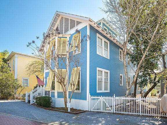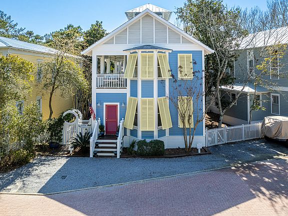 Lone Star Fish commands curbside charm from the moment it catches your eye! Behind the sunny yellow shutters and that candy apple red front door (which has been featured on Southern Living's social media) is a happy feast for the eyes. Once entered, you're greeted by a generous porch running the entire length of the house. Inside, a warm and inviting living room beckons you. The adjoining dine-in kitchen is spacious, bright and cheerful. Plenty of cabinets and storage space make for maximum efficiency. A charming guest bedroom, bathroom and laundry room complete the first floor.The second floor features a spacious and beautiful Master Suite with its own bathroom, sitting area and private porch. A hallway (with access to a second porch) runs from the Master Suite to a lovely second guest bedroom and bunk room (connected to a Jack-and-Jill bathroom). Moving up, the third level's enclosed tower has two observation decks offering stunning panoramic views of Seaside from sunup to sunset; and bountiful star glazing at night. Numerous built-in bookshelves here, and in other parts of the home, will display your favorite beach reads or those treasured first editions.