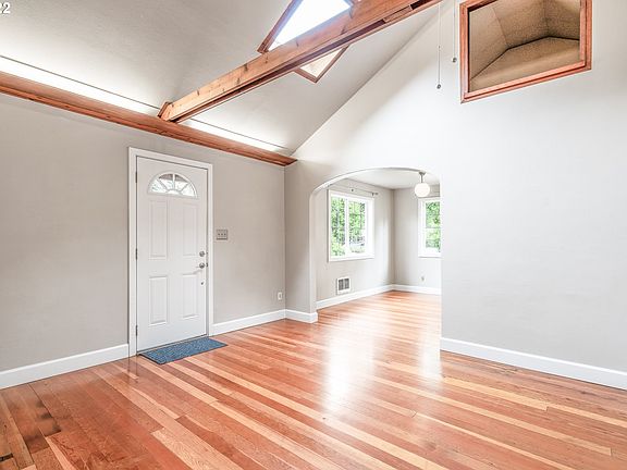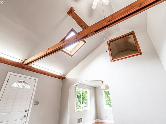 - Features: Beamed Ceilings, Ceiling Fan, Coved, Skylight, Wood Floors