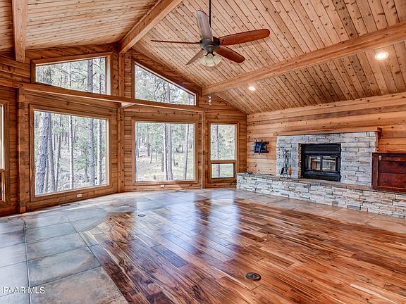 Living the dream in your own private mountain retreat on two acres of beautiful pine trees with a seasonal creeek.The solid cedar log home structure has 2,149 sq. ft. The great room has soaring ceilings with one wall of windows that showcases the pines trees plus the huge stone fireplace. The gorgeous kitchen has exquisite rustic Hickory cabinetry with lovely granite countertops and all black appliances with a spacious sunny dining area.The flooring throughout the home is beautiful porcelain 24' x 24' tile and lovely engineered hardwood.Both bathrooms have large walk-in showers. The first level with the two bedrooms newly remodeled includes a corner fireplace. The 12'x16' art studio could be a She-shed or Man cave.NEW ROOF INSTALLED 2023!! New stairlift. 16 kw generator. NO HOA