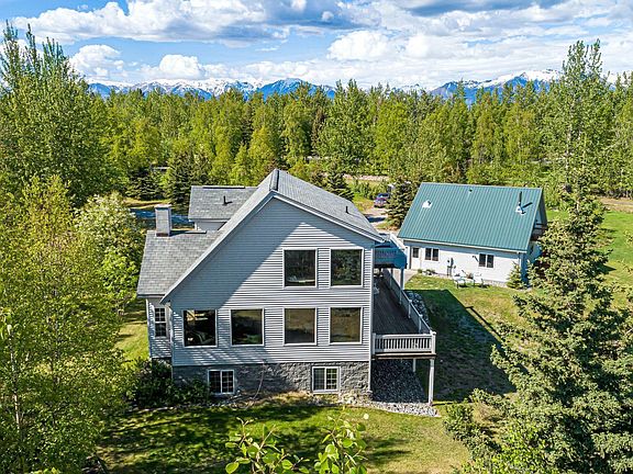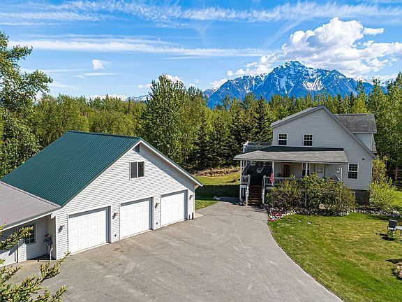 Quiet 5 acres Estate in Palmer! Custom Craftsmanship throughout the home. Paved parking. Top quality materials and an open layout. A perfect setting. 3 car garage plus a huge workshop area. Bonus apartment above the garage! River run rock fireplace is the real deal. Relax on the covered porch and enjoy one of the best commutes in the Valley. Watch the 3D tour in photos, then come see this home.