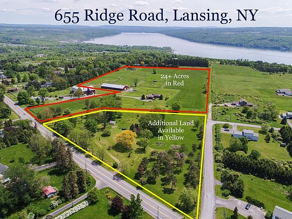 Rare opportunity for land, horses and homes!! 24.45 acres of land, horse facilities, an indoor riding arena, 12-horse stalls, paddocks, the ability to make your own hay, hay storage, and the grounds are set up for active training, teaching and all around horse friendly property. Custom-built 2-level Brick Home with 4 bedrooms/2.5 Baths, Large Lakeview Deck, Open Kitchen/Living Room/Dining Room with windows on lake, lower level has Canning Kitchen. Potential for Single family home on upper level and separate area for Equestrian Business Needs (Office/Event Space/Classrooms) Sweeping sunsets, looking South at City of Ithaca & Cayuga Lake. A unique opportunity in the Lansing School District and a very short distance to Cornell University and the Cornell Vet Hospital/Veterinarian program. Potential to build additional home(s) on site. There are additional building lots and or more pasture available. Call Buyer's Agent NOW!