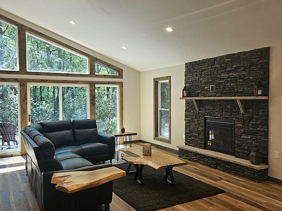 Stone fireplaceWood-grain vinyl sidingBeautifully wooded lot