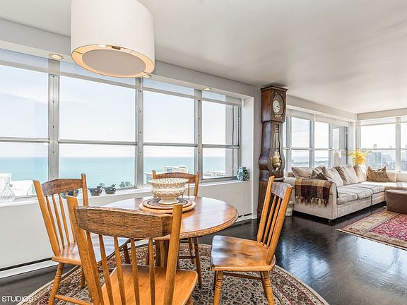 You owe it yourself to see this unit! Dare to live your dreams. Not only does this home have beautiful finishes, but crazy flippin' views! Begin by walking into a delightful foyer. Continue into the 1150 sq ft two bed 2 bath covered with dark ebony hardwood flooring and custom electric shades in every window throughout. You will first notice the wall-to-wall views of everything that Chicago has to offer in this corner unit. Whether your sights are set on the lake, the skyline or Wrigley Field, you will not be disappointed. Imagine yourself in the efficient kitchen showcasing stainless steel appliances, stonework and beveled high-gloss glass backsplash. The bi-level counter and breakfast bar is designed for a lifetime of daily use. The dining area has the same electrifying views. The breathtaking open living room speaks for itself. Both well-proportioned bedrooms are south facing. The smartly designed ensuite bathroom with an extravagant shower is customized to provide a tranquil stress-free setting. The meticulously crafted guest bath is done with glass and hand cut limestone. This transformed unit is both plush and awe-inspiring. The proximity to parks, running and biking paths, and a golf course make it a great choice for active individuals. The nearby eclectic restaurants and Wrigley Field offer plenty of entertainment options as well. Live in a full-amenity building with 24-hour door staff, state-of-the-art exercise center, media room, and party room that provide a lot of convenience and comfort. The outdoor area with a sundeck, junior-sized Olympic pool, cabanas, grills, and basketball court is a great place to relax and enjoy the outdoors. Access to the dog park through the heated garage is convenient during colder months. The market, dry cleaners and soon-to open spa on the first floor make daily life easier for residents. Overall, this unit is a luxurious and impressive place to call home.