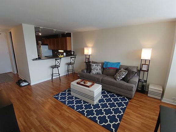 Available July 1. Studio with privacy wall to conceal bedroom area. Wood laminate floors. Open kitchen with breakfast bar. Nice South views overlooking building swimming pool and sundeck. Rent inc Heat, AC, Basic Cable, Internet, water, doorman, pool, gym. Bldg also has large sundeck with BBQ area, hot tub, cabanas. Also Movie Rm, Party Rm, Yoga Studio, Dry Cleaners, Convenience store, Salon, Basketball Court. Large on site laundry facility. Great location, just off LSD near the Lake. Great public transit nearby; Red Line Sheridan stop or Express Busses near Marine. AVAIL JULY 1. No Security Deposit. First & Last Month rent due at lease signing. Bldg charges a non-refundable move in and out fee of $225-$325 based on weekday/wknd moves. If needed, parking rental can easily be found separately in bldg garage. Sorry no pets. Minimum 1 year lease.