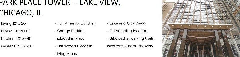 For rent is a SPACIOUS one (1) bedroom condo apartment. On 32nd floor, with gorgeous views of the lake , the expansive City of Chicago skyline view. Spacious One bedroom with large closet Storage closets and entryway closets Kitchen cabinets - modern built Modern Kitchen appliances Hardwood floors (easy cleaning) Granite counter top kitchen area and eating area Amenities included: - 24 hour security - Inside building parking w/ valet service (parking included) - Gym and weight room inside building - TV and internet service with RCN Complete open floor (no furniture included). Parking available additional cost $125 1 year