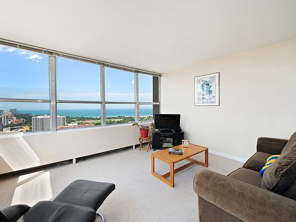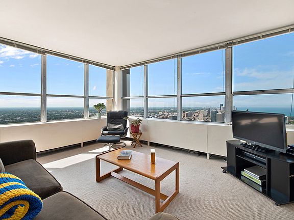 Residence #4116 is a corner 1 bedroom, 1 bathroom home with oversized windows, framing expansive Lake, Wrigley Field, and City views. Interior finishes include Neutral colored carpet and paint tones. The condo has a galley style kitchen with granite countertops, cherry cabinetry, and Stainless Steel appliances. The master bedroom has a wall of closets. Park Place Tower boasts an expansive collection of lifestyle and wellness amenities, including a state-of-the-art fitness center and basketball court. Residents will also enjoy a multitude of entertainment facilities including an outdoor lounge complete with kitchen, a private theatre, party room. Additional conveniences include a 24-hour attended lobby, a newly updated pet park, plus bicycle storage, private commercial storage, and the nicest pool area on the north side. Deeded parking Self-Park additional 20k