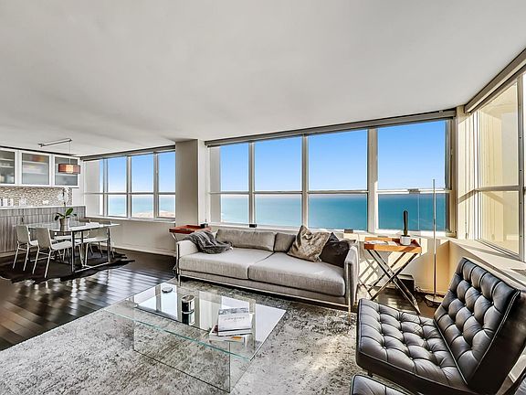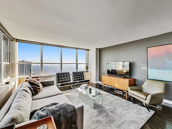 Why compromise when you can have it all! This stunning high floor 2BD/2BA corner unit has been recently renovated and the exceptional attention to detail is evident from the moment you walk through the door as every element has been thoughtfully curated down to the finest details. This home boasts espresso hardwood floors throughout and panoramic windows offer unparalleled views of the city, lakefront, and Wrigley Field! Open kitchen complete with Ultracraft soft close cabinetry, sleek quartz countertops, custom tile backsplash, premium SS appliance package, and breakfast bar. The floorplan flows effortlessly to the formal dining area, perfect for entertaining! Take in the morning sunrise over Lake Michigan while enjoying your morning cup of coffee in this home's sprawling living room. Spacious primary bedroom easily accommodates a king bed and features ample closet space. Ensuite bathroom complete with sleek low profile dual vanity, multi head shower w/glass surround & seat, and upgraded cabinets for storage. Generous spare bedroom comfortably fits a queen-sized bed and showcases a cavernous wardrobe closet and could double as a home office. The Assessments include Heat, A/C, Cable, Internet, 24 Hour Doorman, Outdoor Pool, Sundeck, Grills, Basketball Court, 24 Hour Fitness Center & more. Place Towers is a Full Amenity Building and Features a Market, Cleaners, Theater & Party room. Deeded Self-Park Garage Space B-26 is Included in the Price. Schedule your private showing today!