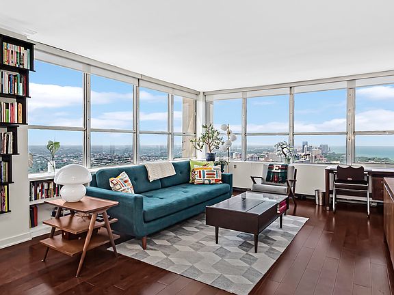 Stunning updated large 1 bedroom corner unit on a high floor with breathtaking panoramic views of the Lake, Harbor and Wrigley Field. The unit features hardwood floors throughout and full wall of custom built-in bookshelves for extra storage. The galley style kitchen has granite countertops, maple cabinets, and stainless steel appliances. The primary bedroom offers a wall of closets and a captivating lake view. Indulge in endless building amenities, including an oversized pool, sun deck, basketball court, grilling area, club room, movie theatre, fitness center, and 24 hr door staff. Additional conveniences include package receiving, dry cleaner, on-site management, and a convenience store. HOA fee covers heat, air conditioning, cable, internet, scavenger, water, and access to gym, pool and basketball courts. Live in luxury with panoramic views and an abundance of amenities.