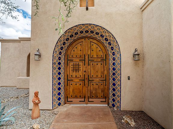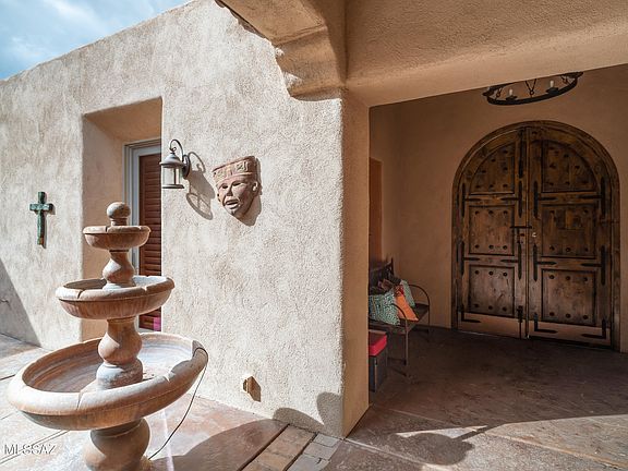 Exquisite gated Santa Barbara Ranch-style estate showcasing the pinnacle of Southwest elegance with unobstructed, panoramic views of the Santa Rita Mountains. Every detail of this home reflects thoughtful design, luxurious craftsmanship, and the seamless integration of indoor and outdoor living, offering a rare lifestyle of privacy, serenity, and refined entertaining.Enter through a tranquil courtyard featuring a classic fountain and Southwest-tiled gas fireplace, connecting gracefully to the foyer, office/den, primary suite, and guest accommodations. The courtyard sets the tone for the home's signature indoor/outdoor flow, inviting natural light and sweeping mountain vistas throughout the main living spaces.The gourmet kitchen is a chef's dream, featuring a Wolf six-burner gas stove, Sub-Zero refrigerator, expansive island with breakfast bar, and premium custom cabinetry. A wet bar with ice maker and wine cooler elevates entertaining, while a formal dining area adjacent to the kitchen and great room provides an elegant setting for intimate dinners or grand gatherings. The adjoining family/media room boasts state-of-the-art audiovisual systems, offering a cinematic experience for movie nights and sporting events.