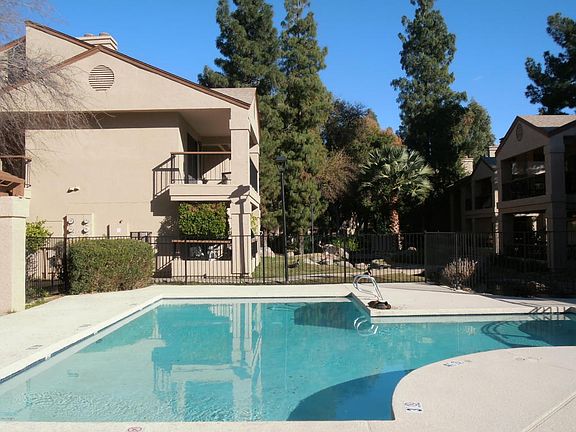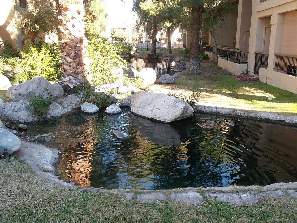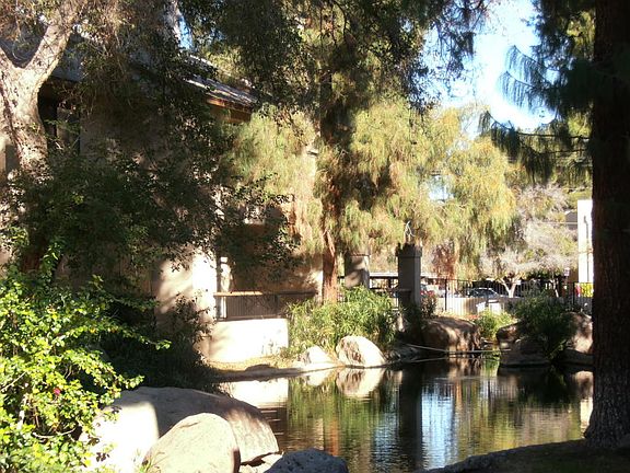 2nd bedroom is open Loft with closet, shares a Jack&Jill full bath with front-facing Master Suite with walk-in closet. Cool running stream meanders the length of the complex, and is accessible through the private patio gate. 2 fenced pools with Ramada picnic areas, NEWER stack Washer & Dryer, powder room downstairs, quaint kitchen with side by side fridge, dining area + high bar off kitchen, great room holds a wood burning fireplace, high vaulted ceilings and views of the water ponds and stream. Home is set back one building from the street, and the reserved covered parking is conveniently directly in front of the home. Complex is across from a large grassy city park with mature shade trees.