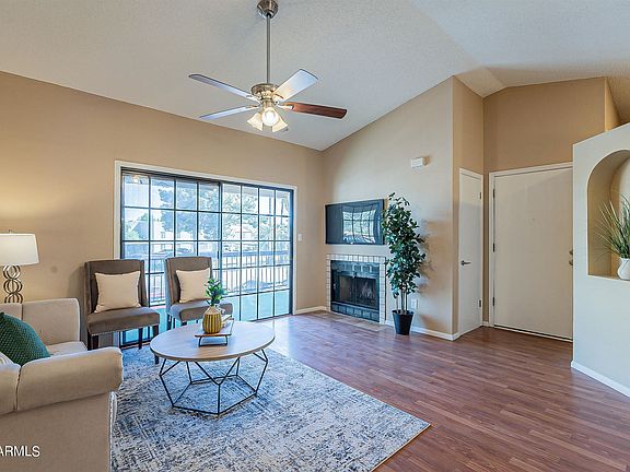 Rare find - Unit with fireplace and GARAGE priced in the $150's! Updated unit with beautiful grounds, vaulted ceilings and private entrance. Newhardware, lighting and fixtures. Wild ducks walk around the private ponds and streams, while the shade of the trees and babbling sound of therunning water creates a cool and relaxing atmosphere all year long. Large rooms, vaulted ceilings, and good storage space creates a spacious feeling;ceiling fans and SRP electric for low utility bills; private, safe and secure second level balcony and gated front porch for peace of mind; andindoor laundry with washer/dryer included for your convenience. Community has two pools and a spa! Located near Grand Canyon University, shopping,restaurants, Westgate entertainment district and the I-17.