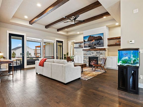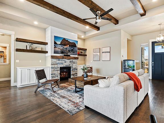 Luxurious and rural, you can have it all. Limited ccrs provide you with beauty and freedom at the same time. This custom home is settled on a corner lot boasting priceless views of the mountains, trails and the ability to explore them while living in quality, newer construction with class. Lofty ceilings, extra natural light and a neutral palette allow the right pieces like the stone fireplace, built in cabinets, floating shelves and exposed wood beams to take center stage. On top of that the a dream kitchen and large island opens the space to a multitude of possibilities for you to take your pick. Entertain on the patios designed for sunrise and sunset or soak on your private hot tub patio with no one else around. Don't forget the large heated and insulated shop with a half bath, kitchenette, gym and space for toys, tools and tasks! Custom slanted room for easy cleaning is an ideal space for animals of all kinds and a mud room for muddy paws.