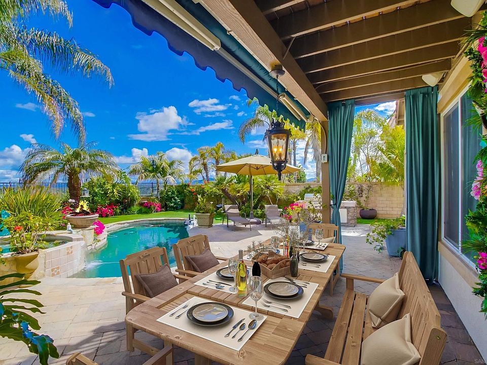 Stunning family and entertainer's dream home in Sorrento Valley with huge canyons views!!!! OWNED SOLAR, NEW WATER HEATER AND A/C SYSTEMS AND BRAND NEW DISHWASHER. Enjoy vaulted ceilings in the family/living room and dining room with gas/wood burning fireplace- all opening up to the lush and tropical garden and pool area with fire accent basin attached to the pool, hot tub and custom bbq. Mature fruit trees, roses, birds of paradise, etc...with canyon views for miles. There is a retractible Sunbrella awning in the back outdoor living area. Chef's kitchen and pantry with granite counters, stainless steel appliances, European style cabinets and large kitchen island. Large primary bedroom suite with a walk-in closet, a balcony overlooking the pool area and canyon and a shower for two with canyon views. There are 3 other bedrooms on the second floor, one has been converted into a "CALIFORNIA CLOSET-STYLED" dressing room and another has been converted into a HOME OFFICE; both can easily be reconverted to bedrooms. The largest guest bedroom is on the opposite side of the second floor from the primary bedroom for maximum privacy. The second bathroom upstairs offers a bathtub and shower. Three car garage for the ULTIMATE MAN CAVE, with room for a work bench, fitness area with a mounted tv, man-cave bar, etc...lots of storage. Easily park two more cars in the driveway. Additionally, there is a gated side yard built for a dog run or used for outside storage. HIKE TO THE WATERFALL IN THE CAYNON BELOW....WELCOME HOME TO YOUR BEST LIFE!