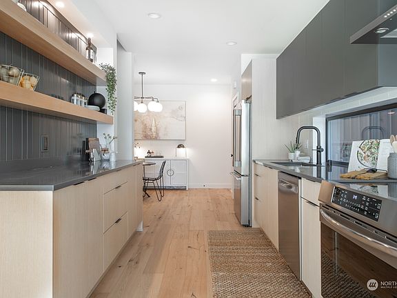 Another incredible project by boutique builder Modern Den! Welcome home to this beautiful quality construction townhouse in the heart of Phinney Ridge. Designed with natural light, this townhouse offers designer finishes including top of the line appliances, wide plank hardwood floors, & quartz countertops. Head upstairs to the 2nd level complete with two bedrooms & a full bath. The 3rd level showcases the primary bedroom with Scandinavian finishes, walk-in closet, & spacious bathroom w/double vanity. Don't miss the roof top deck with stunning 360 degree view of the city! One off-street parking space and extra storage. Just one block to restaurants and shops!