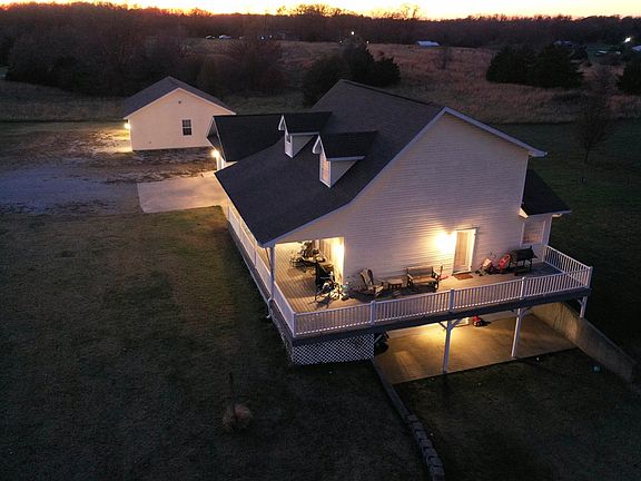Property priced below appraisal!!!Gorgeous views and sunsets from this wrap around, covered porch with composition decking. Custom built home in a desired location on 12 beautiful acres!! 5 bedroom, 5 bath with a full finished walk out basement and kitchenette, perfect for in-law suite or entertaining. This home has elegant arched door ways throughout, bull nosed corners and 10 foot ceilings. Kitchen has custom oak cabinets and upgraded counter tops. 3 master bedroom suites. All 5 bedrooms feature large walk in closets. Need storage? This house has plenty!! 2 car attached garage and a detached garage/shop. Inspections recently completed and septic recently pumped. Call today for your private showing!