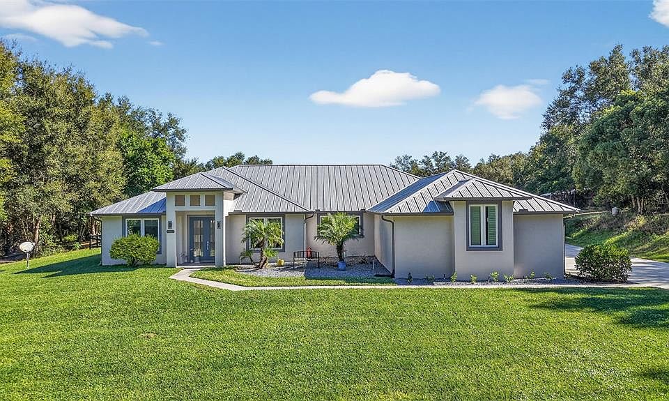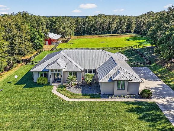 Enjoy peace, privacy and open space the minute you turn down the tree-lined driveway in this custom-built 2018 home. Situated on 5.8 acres just minutes from historic Downtown Mount Dora, this modern house has been thoughtfully designed for indoor-outdoor living with an open-concept living and dining room featuring sliders that open out to an expansive lanai. The saltwater pool is completely screened and overlooks the serene pasture, creating the perfect space for entertaining or quiet relaxation. Inside, the kitchen is a beautiful gathering spot with a sprawling cooktop island, quartz countertops, farmhouse sink, built-in appliances and custom cabinetry. The large, oversized windows in every space allow you to soak in the natural beauty and privacy this property affords. Retreat to the primary bedroom with pool views, an electric fireplace and luxurious en-suite bath complete with a walk-in shower, separate vanities and ample walk-in closets. Enjoy easy access to the laundry room directly from the primary suite. The split floor plan provides the two guest bedrooms with privacy, each with their own bathroom. And the dedicated office space is both beautiful and practical with double-door entry and another oversized window. When you step outside, you have a fully fenced backyard with premium ProVista St. Augustine sod, fruit trees and quick access to a newly built 40x50 metal building and attached lean-to. Inside the detached metal building, you'll find dedicated storage space for recreational toys, equipment, and livestock supplies. Walk through a set of double doors and you're welcomed by an additional 1,360 air-conditioned square feet of entertaining space. With a 4K projector and 150-inch screen, you can enjoy sports, tv and movies from the luxurious comfort of the custom-built stadium seating recliners. An additional three 65-inch TVs, built-in bar, pool table, darts, putting green and video games means there's no shortage of ways for you and your guests to enjoy the ultimate entertainment haven. When you want a break from all the excitement inside, just step out to the covered porch overlooking an irrigated garden and fenced pasture complete with top-board and no-climb wire — ready for your livestock to call home. Other deliberate additions to the property include a whole-home generator, electric car charging and RV outlet, asphalt driveways and oversized chicken coop. While the property is tucked away in a quiet setting on land with no HOA or deed restrictions, it offers both privacy and convenience. Just a mile from downtown Mount Dora and its historic shops and restaurants, and nearby access to Highway 441 and Interstate 429 connects you to Orlando’s business hubs, premier shopping, airport, world-class attractions, and Florida’s beautiful East Coast beaches.