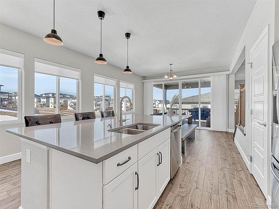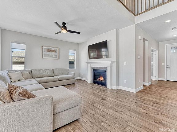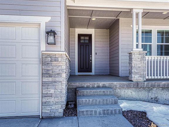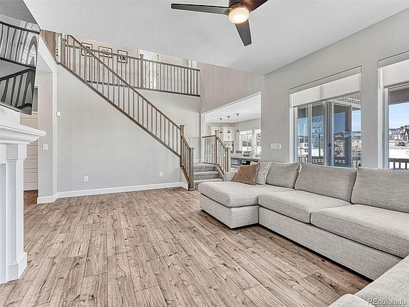 Beautiful 2021 built, 4br Castle Pines home backing to open space offers room to grow and breathe. Contemporary light fixtures, luxury vinyl flooring, stainless appliances, high ceilings and window blinds are stylish and functional. The morning sun-drenched covered porch begs to be enjoyed over coffee. Fantastic natural light streams through the main floor office windows and the glass French doors add privacy when needed. The great room layout for the kitchen, dining area and family room is engaging. Dramatic and eye-catching, the fireplace with dark quartz surround and white mantle is a stunning focal point. Beautiful quartz counters, stunning kiln fired style subway tile backsplash, stainless steel appliances and white wood cabinetry with soft close drawers combine for a luxurious feeling. A 5-burner gas stovetop with overhead stainless range hood and the built-in oven/microwave combo are impressive kitchen partners. Beyond the spacious kitchen island the dining area offers room to add a large dining table. The oversized slider leads to the covered deck with stairs to the fully fenced backyard. Upstairs the private, large master suite is located separately from the other bedrooms. A large tile shower, walk-in closet and dual sink vanity provides room to relax. Three additional bedrooms share a full bathroom, offering room to grow. Keep laundry upstairs thanks to the upstairs laundry room. Easily add another work space if needed in the light-filled loft. A 3-car tandem garage has space for a work area, toy storage or extra fridge. An unfinished walkout basement has an extra-wide sliding door leading to a concrete patio and offers exceptional flexibility for future needs. With a brand-new furnace, tankless water heater, sump pump and sprinkler system, this home on a pie-shaped lot offers both peace of mind and stylish suburban living. Located in a small community with parks and trails steps away, settle in and make your future in this beautiful Castle Pines home.