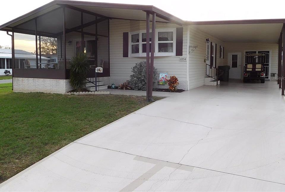 Enjoy this lovely well maintained furnished 2 bedroom 2 bath manufactured home in 55 plus community with many upgrades. You own your lot, no lot rent. NEW SHINGLE ROOF INSTALLED JANUARY 2024 ON HOME, WITH NEW METAL ROOF ON CARPORT AND WORKSHOP. A/c new in 2021 and has 10 yr warranty for parts and labor. All appliances stay. Spacious open floor plan features two large bedrooms, 2 baths, and large open living room with new sliding door going out to screened lanai and newer windows. Newer kitchen counter tops with double sink and faucet and newer bathroom sinks and faucets. In ground sprinkler system. Finished utility room/workshop with dbl gate styled doors for easy access. Golf cart parking. No lot rent, you own the land. $34.00 monthly HOA dues include use of community clubhouse, heated pool, shuffleboard court and RV lot.