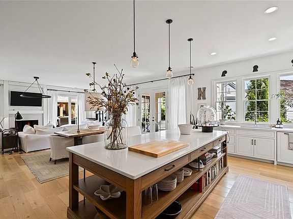 Limestone fireplace surroundHigh ceilingsThree-car garagePeaceful lake viewsOversized custom islandStone wallsCustom wood beams