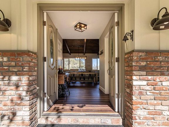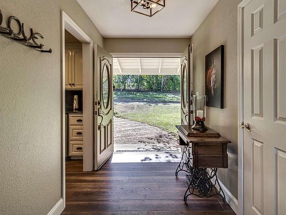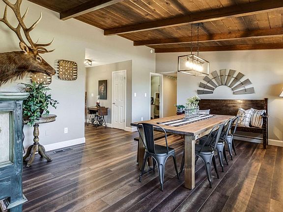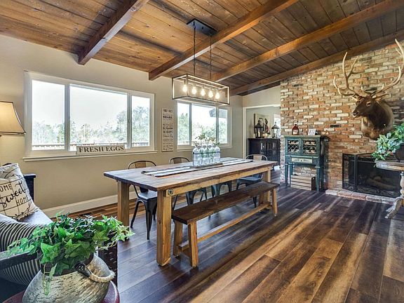 Modern farmhouse style 4 bedroom, 2.5 bathroom home incorporates many new features while staying true to the homes original character. A formal entryway opens to expansive formal dining room, lined with a wall of windows overlooking the vast rear pasture. Wood beamed ceilings and an enchanting dual sided brick fireplace wraps around to the living room, which also provides a sliding glass door leading to the back deck, blending indoor and outdoor living. An updated eat-in kitchen provides built-in bench storage seating, ample cabinets, granite counter tops and is flooded by natural light from the many windows. A half bathroom is conveniently located for easy guest use. Set away from the main living spaces are the bedrooms, including a grand suite, creating peaceful, restful retreats. This beautiful ranch style home is situated on a tree lined, oversized, fenced lot of approx. 1.2 acres. with wrap around driveway, upscale chicken coop and large pasture.