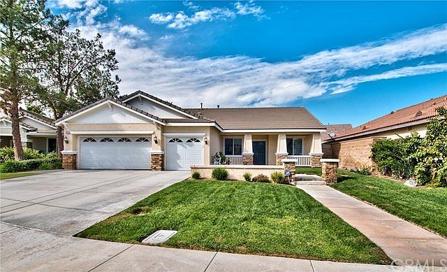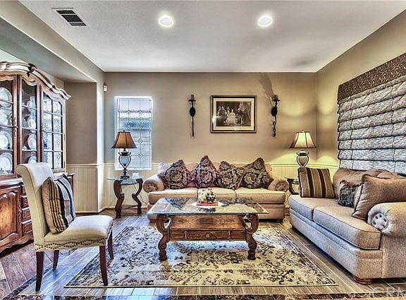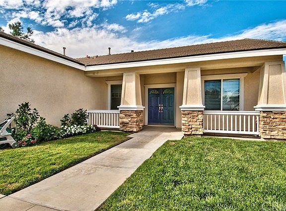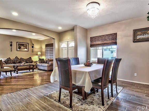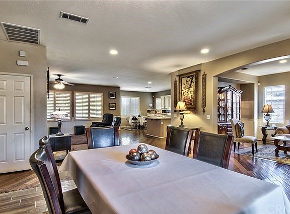 Beautiful Eastvale Single Story home located on a cul-de-sac. This home boasts designer touches like: upgraded flooring, neutral paint, recessed lighting and much more! The entrance shows the open layout. The Living Room has a privacy glass window and wainscoting. The Dining Room is open and flows into the Family Room that has shutters, ceiling fan, surround sound and fireplace. The Kitchen has been upgraded with light colored cabinets and tile counters and backsplash. The gas cooktop and double ovens are great for those that love to cook and there is a wonderful walk in pantry! The Hall Bathroom has tiled walls, new tile flooring, storage and designer lighting. The Laundry Room has storage. The two bedrooms are sized well. The Master Bedroom has crown molding, a ceiling fan, chair railing, new flooring along with a sliding door to the back patio. The Master Bathroom has been upgraded to include: walk in shower, a retractable seat on the inside, glass block for natural light, privacy glass, designer lighting, dual sinks and extra storage. The mirrored closet door leads into a large closet with and organizer to create even more storage. The Garage is 3 Car with epoxy flooring and overhead storage. The Backyard is private with matured landscaping and block walls on all three sides. The home also includes two storage sheds on the side of the home. Located near award winning schools, shopping and restaurants. You will see the pride of ownership in t