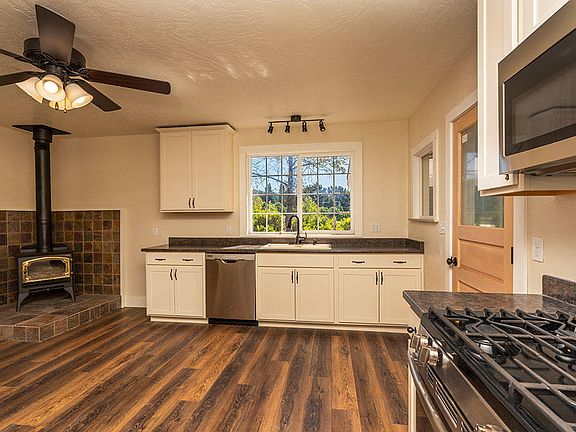 Charming, adorable, two story country home on approx. one acre. This home has just had a complete makeover with new floors, windows, all new kitchen with new appliances, new paint throughout, new bathroom vanities, fixtures, new wiring.. Woodburning stove in Kitchen. Back room can be used as a bedroom or family room. Large laundry room with storage. This 3+ bed. 2 bath home sits on 3/4 of flat usable land.. Three out buildings for storage, lots of fruit trees, large garden area. Close to Cuddeback school.