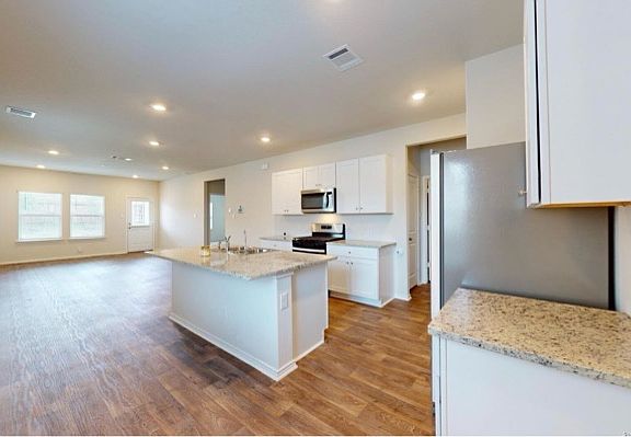 This a two-story home that features 4 bedroom, 2.5 baths, 2-car garage. The gourmet kitchen includes granite counter tops, black appliances, and an open concept floorplan with the kitchen leading to the dining and living room area. A powder bath is located off the entry foyer nook. The private downstairs first bedroom is built with an attractive ensuite which includes a walk-in shower, water closet and grand walk-in closet. A versatile loft greets you at the top of the stairs and is a perfect entertainment area. All secondary bedroom and second full bath are also located upstairs. The rear covered patio located off the living room comes as a standard built-in. Additional features include sheet vinyl flooring in entry, living room, and all wet areas, granite bathroom counter tops, and full yard landscaping and irrigation. This home includes our HOME IS CONNECTED base package which includes the Amazon Dot, Front Doorbell, Front Door Deadbolt Lock, Home Hub, Light Switch, and Thermostat.