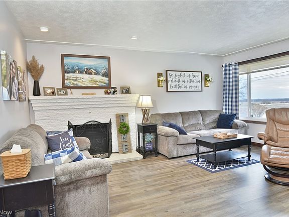 A Johnson Township treasure, this all-brick, 4 bedroom ranch packs two floors of wonderfully finished living space all surrounded by a gorgeous, semi-rural setting! The desirable layout packs an impressive yard that’s easily taken in from the elaborate rear patio. Here, the new 2022 metal roof covering accents a massive concrete pad and towering stone fireplace. A storage shed joins the oversized 2 car attached garage to round things out. Step through the decorative front door to find yourself immersed in a decadent living room. Natural light pours from the front picture window as it cascades past the white brick fireplace. Hardwood-styled flooring continues into the nearby kitchen and dining room where a casual corner eatery overlooks dark stained cabinetry and a large center island, all dressed in stone-look countertops. Additional pantry space awaits the basement entry. Rich hardwoods line the main hall, running past a pair of brightly painted and new 2022 carpeted bedrooms. The inv
