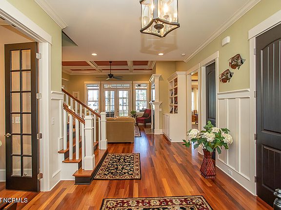Have a look at this absolute stunner on .54/acre backing up to the par 5 5th hole of Panther's Run Golf Course with fairway to green views. No detail was overlooked in this Energy Star Certified 2011 Parade of Homes Diamond Award Winning home built by Whitney Blair. A low country style home with hardie siding, it sits high on its brick foundation to take advantage of the phenomenal views. Beautiful Brazilian teak (cumaru) flooring flows through the first floor living areas. Coffered ceilings, built-ins banking the LR fireplace, custom molding, and 9 foot solid doors throughout add another level of dimension and detail. This home was built with entertaining guests in mind with a free flowing open floor plan, huge kitchen with granite counters, custom cabinets, double wall ovens, gas cooktop, 2 wine fridges, a bar, and walk-in pantry. Huge dining room with gorgeous tall windows looking out to the golf course with lots of natural light shining through. The transom window wall in the Living Room opens to the screened porch and down to the brick patio. The primary suite features a trey ceiling, tall windows, carpet in the main area and the dual dressing areas; dual vanities and tiled shower and floors in the 'wet' areas. Two additional bedrooms and a den/office complete the first floor. The second floor has an additional bedroom, a full bathroom, a flex room which could be used as an entertainment room or even a 5th bedroom and TONS of walk-in storage in the floored attic. This beauty needs to be seen in person to appreciate all of the thought and TLC the original owners have put into it. Ocean Ridge Plantation is widely regarded as the premier community in Southeastern NC. It has something for everyone-4 golf courses, 2 golf clubhouses, a heated indoor pool, sauna, steam room, jacuzzi, fitness center, outdoor pool, pickleball courts, a nature pavilion, walking trails, a community garden, over 65 social clubs, and the beach clubhouse on Sunset Beach!