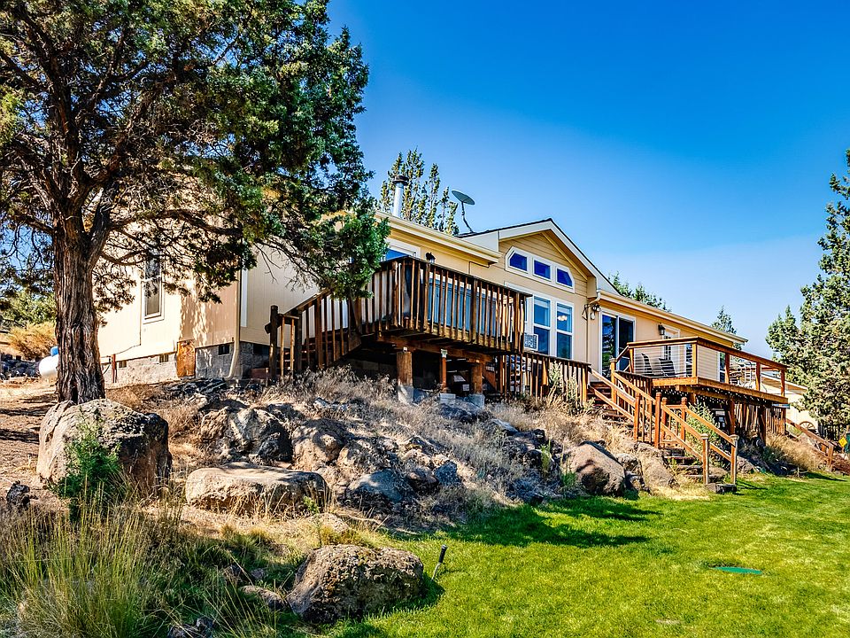 Stunning northern and eastern views and conveniently located between Bend and Redmond with room for livestock or additional outbuildings. This impeccably maintained, turnkey manufactured home sits on a beautiful, private 3.15 acre lot in the heights of Whispering Pines, surrounded by million-dollar views.