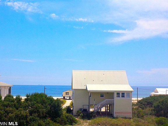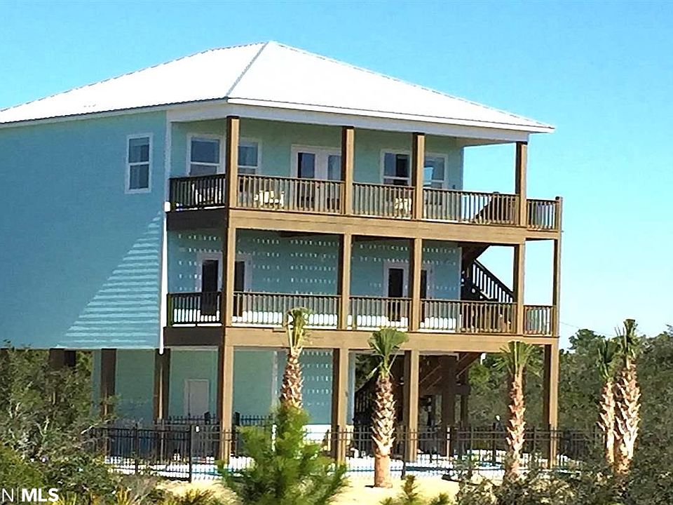 A beautiful five-year-old 5-bdrm, 4.5 baths, ocean view home with a low-maintenance fiberglass pool. Ideally situated on top of a dune close to the ocean offering spectacular panoramic views of the Gulf. The home is custom-designed and featured in the 2018 Gulf Shores Tour of Homes. The 9-foot ceilings, light decor, and southern exposure give an open, airy coastal feeling. The top-level has French doors out to the deck, perfect for taking in the soothing sound of the ocean, gulf views, and starry skies! The home is easy to maintain and well-built with 2X6 construction, foam insulation, hurricane windows, hardie-siding, metal roof, and two AC units. The kitchen has beautiful glass door cabinetry, beach-glass backsplash, SS, granite, and the dining area that seats 12. The ground floor has an indoor entry/stairway with storage room and locked storage. Walkout to the gated saltwater in-ground pool with a large tanning shelf. Enjoy a night swim with spectacular in-pool lighting and a hot/cold poolside shower. Parking provided under the house and an additional parking pad. The home is located in a private beachfront community on Fort Morgan away from the crowds and congestion. The neighborhood is low density with ½ acre lots, coastal homes, sand dunes, natural coastal vegetation, and private beach access. The home sits in a private coastal setting about 200 yards from the beach and is a quick walk to the private beach. This home makes an ideal vacation rental with an impressive three-year rental history (79K in 2018).