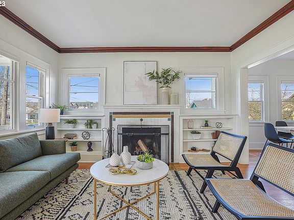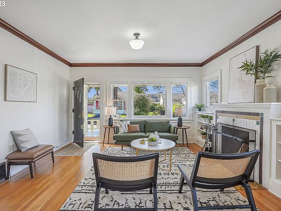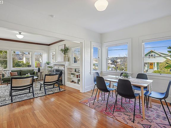 Perched high above the street, this darling 1920s Craftsman-Bungalow radiates charm & character with its original details like sun-drenched front porch, hardwood floors, built-ins, & leaded glass windows. Desirable floor plan features two beds & bath on the main level, along with wood-burning fireplace & dining room. Spacious primary bed on upper level, with additional bed & bath on lower. Relax in your private fenced backyard with patio, hot tub, garden beds, fruiting apple trees and covered back porch! Enjoy all the perks of the Woodlawn neighborhood like walkability to nearby coffee shops, restaurants, parks, and farmers market! LOW PROPERTY TAXES! [Home Energy Score = 4. HES Report at https://rpt.greenbuildingregistry.com/hes/OR10213452]