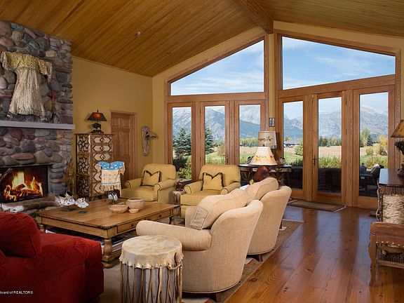 Spectacular Teton views are captured from every room in this fantastic five bedroom Bar B Bar Meadows home that borders open space on its North and East boundaries . The floor plan is both cozy and open, with vaulted ceilings and hardwood floors, a two-sided fireplace between two separate living rooms, privately laid out bedrooms and well-appointed bathrooms. Decks surround the home and manicured lawns and gardens are characteristics of the three acre parcel. Wildlife viewing is incredible due to the migration corridor and proximity to GTNP. A greenhouse is accessible from the attached three car garage. The lower level has a huge game room, wet bar and two additional bedrooms. With room for guests and loved ones, it is a special property to create a lifetime of Jackson Hole memories.