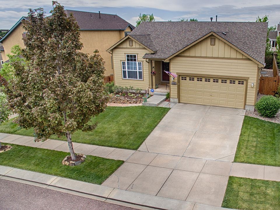 It shows like a Model! Experience this flowing ranch style floorplan in Ridgeview at Stetson Hills w/ a dynamic layout ~ updated w/ amazing finishes! The mature, gorgeous landscaping draws you towards the entry. Hardwood floors adorn the entire main level & are accented by 9ft. ceilings, plus the fresh interior paint gives a cool, refreshing feeling to the main level. Updated kitchen w/ amazing "Alaska White" slab granite that includes an eat-in island, 42" cabinets plus pull-out drawers, upgraded appliances, & pantry. Walk out from the kitchen to the wood deck, where you will feel a world away from the stress, plus the deck is built so that you are buffered from the elements ~ the perfect place for a summer bar-b-Que! The yard is a tranquil paradise, full of low-maintenance bushes & trees plus a river rock dry creek. Back inside, the family room opens to the kitchen & has a beautiful glass mosaic-tile accented gas fireplace. The main level master suite features hardwood floors, coffered ceiling, & a 5-piece bathroom w/ soaking tub, slab granite dual-vanity sink, separate shower, & walk-in closet. There are two additional bedrooms, both w/ hardwood floors & a full bathroom w/ tile floors & granite countertops, plus a separate laundry room that completes the main level. Downstairs, the finished basement feels spacious & open. There is a large recreation room, two large bedrooms, a full bath, plus a very bonus unfinished room that could be used for storage, workout room, or a potential workshop. Also, the home has A/C! You have found the best of condition plus a location that is perfect ~ near the Powers corridor, close to parks, walking trails, schools, shopping, Peterson, USAFA, Penrose hospital, theaters, & more! This has been the one you have been waiting for!
