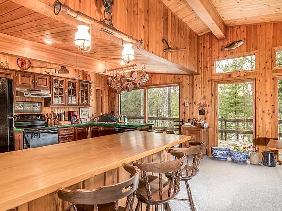 Beautiful Upper Kaubashine Lake home available for the first time. The epitome of "Northwoods" charm, home boasts 129' of SW sand frontage, & end of the road wooded peace & privacy. Beautiful cedar T & G paneling & walls of windows throughout. Spacious main floor master suite is a private sanctuary, w/wood burning fireplace & pvt bath w/walkin shower, double vanity & gorgeous lakeviews. Open concept kitchen & living room w/breakfast island/prep counter, lovely stone wood burning fireplace, & walkout to lakeside sundeck. Two add'l bedrooms w/ample closets & a 2nd full bath complete the main floor. Finished lower level offers family room w/free standing wood stove, a 4th bedroom, 3rd full bath, laundry room & walkout to covered patio. Exterior storage provides shelter for kayaks, canoes & seasonal recreation equipment. Det'd 2 car garage w/woodshed at the back. All this on the "Quiet Side" of the Northwoods where taxes are lower.
