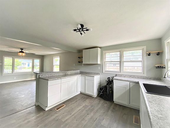 Nice updated 3 bedroom, 2 bath, vinyl ranch home with an open floorplan. Large open kitchen/living room area. Kitchen with pantry and breakfast bar. All new kitchen and bathroom cabinetry, paint, flooring, light fixtures, tub, toilets, shower, faucets throughout. 2nd full bath recently bathroom added. New roof installed 2022. Covered front porch. Back patio. Gas furnace/Central air. Nice size yard. Immediate possession.