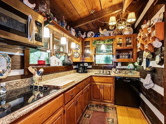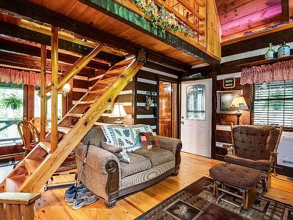 HOME SWEET REAL & SOLID LOG HOME! Constructed with hand-hewn cypress logs. Real Log homes are hard to find and this is a beauty. Rustic quality tastefully built. Stone pillars, Stone walls, Stone floors and a huge wrap around deck that you will want to live on full time with large flat screen outside. LIFE IS GOOD! Carport built to match home Beams & Stone. Plenty of room in finished basement to entertain or room to grow. Room for an outside kitchen. Heavy beams inside & out. Home has been remodeled and so much is NEW or NEWER. 2 Brms include the Loft. Basement bedroom could be added. Heat Pump & Air installed in 2020. Roof 2015. Furnishings & TURN key available. Carport could be enclosed.