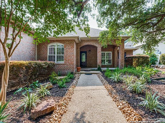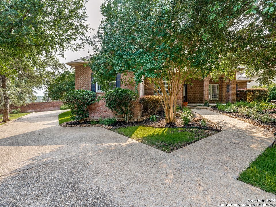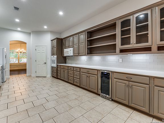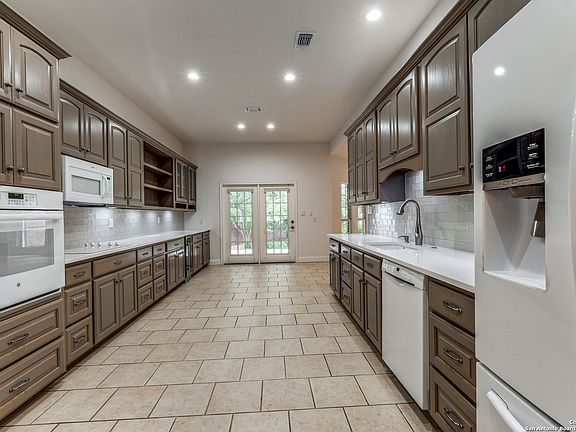 Stunning 3 bedroom 3 bathroom one story home, on cul-de sac, in highly sought after Mission Forest. When walking towards the house you are greeted by a large covered front porch, a humongous tree providing plenty of space, and a custom glass entry door. Once inside you will find extremely high ceilings with crown molding, a gorgeous stone fireplace with gas starter, and lots of windows for natural light. The recently remodeled alley style kitchen comes with custom cabinets, under cabinet lighting, a wine fridge, and an amazing countertop & back splash combination. The formal dining room has a gorgeous chandelier in its center, as well as a service bar, perfect for entertaining. The primary bedroom with bay windows and ceiling fan, also has a large en-suite with his and hers vanity, a separate walk-in shower and a soaking tub. The built in California closet is one of the highlights of the house, providing plenty of storage and perfect organization. On the other side of the home you will find two additional bedrooms, one of them with a private en-suite, as well as another full bathroom with walk-in shower. Another big plus of this home is the almost 300 sqft work shop with window AC unit that is tied to the garage, which is supplemented with a freight elevator leading to the partially finished attic, giving lots of additional storage room. Outside you will find a spacious backyard, covered with large mature trees offering plenty of privacy and shade. The extended deck and extra patio slab, make this backyard perfect for BBQ's with family, friends and neighbors. This homes convenient location just off Loop 337 allows you to be in the hill country, downtown New Braunfels, to schools, restaurants and shopping within minutes. Schedule your private tour today!