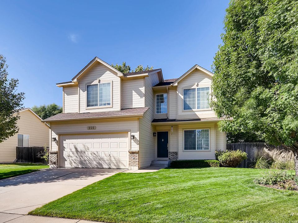 This stunning move-in ready home just hit the market in this gem of a neighborhood in Sand Creek. The sprawling 2-story has 5 bedrooms, 3.5 bathrooms and 3,098 square feet of living space. The first floor features beautiful engineered hardwood flooring throughout most of the main level. The open living room and dining room are beautiful and well-maintained with mountain views and a bay window with storage beneath. The kitchen comes equipped with all appliances (including a gas double-oven!), upgraded soft-close cabinets & drawers, recessed lighting, a pantry, a large island, a walkout to the back deck, and mountain views at the sink. The carpeted family room has vaulted ceilings and a beautiful gas fireplace, making it feel simultaneously cozy and spacious. A powder room and separate laundry room complete the main level. Head upstairs to the oversized master suite, complete with vaulted ceilings, a walk-in closet, and attached bathroom with heated flooring, granite countertops, and tiled shower. Three additional bedrooms and an additional bathroom give you plenty of space to spread out on the upper level. The full basement includes a spacious second family room (24'x14'!), a wet bar with wine fridge and mini fridge, another bathroom, the 5th bedroom, and a large storage room. The entire home also has a newly installed and integrated fire and carbon monoxide detection system to keep you feeling safe and healthy. Head outside to the landscaped backyard, PERFECT for entertaining guests this summer. A privacy fence (front facing fence is new), large deck, patio, lawn, water feature, and mature trees make this the perfect space to relax with a glass of wine in the evening. There's even power for a hot tub if that's part of your ideal oasis! Located on a cul-de-sac just 0.2 mile from the local elementary school, this is the clean, well-kept, move-in ready home you've been dreaming of.