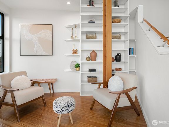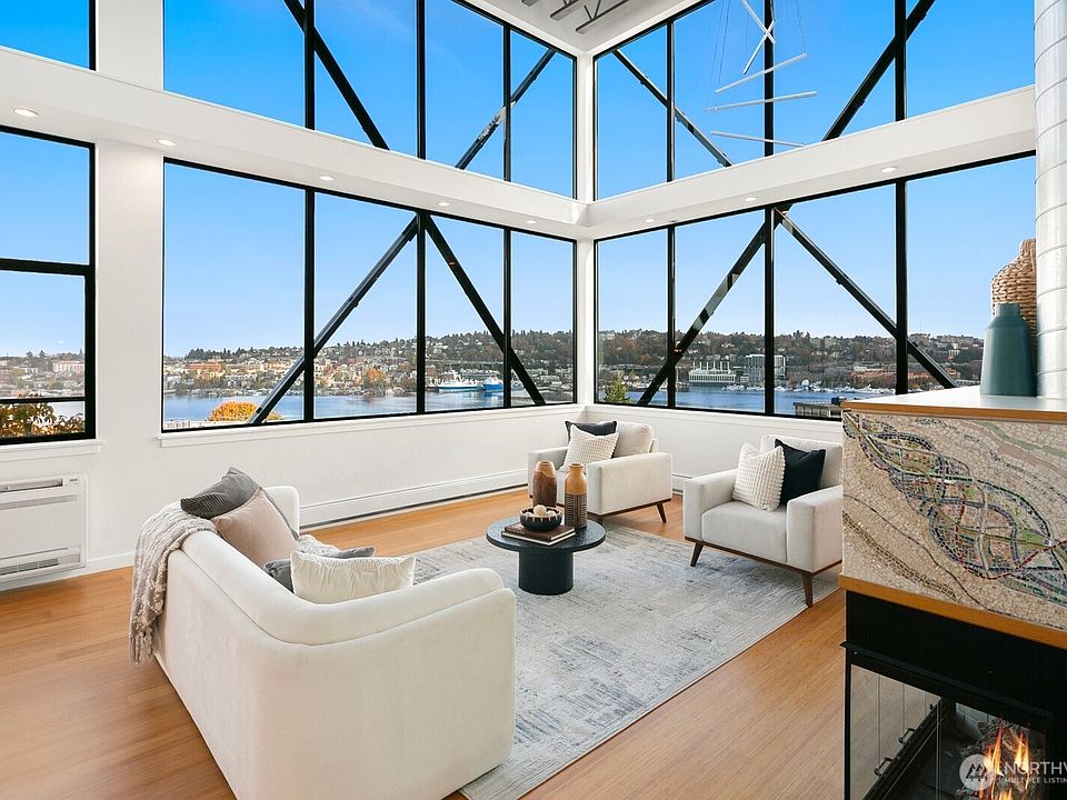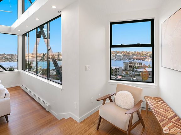 Iconic modern home in Westlake w/ unparalleled views of SLU, Downtown Seattle & the Cascade Mt range from every floor of the house! Privately situated on a dead-end cul-de-sac with abundant parking this home was custom built for entertaining w/ a chef's kitchen, expansive rooftop deck, & large mezzanine w/ 270 degree views that can host a dinner party seating over 50+ people. Warm natural finishes throughout including bamboo floors, custom wood built-ins & Murphy beds. House has an elevator to 6 levels of living including a level w/ ADU unit with 1 bedroom. Tech-wired house with ethernet/coax to every room. Landscape includes an outdoor garden bed & fruit orchard. Rare floorplan in walking/biking distance to Fremont, SLU, Downtown & more!