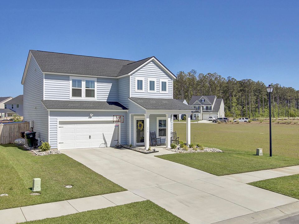 Don't wait for new construction! Welcome to this nearly new home in the charming neighborhood of Cypress Preserve - close to Cypress Gardens, Joint Base Charleston Weapon's Station, and the new Berkeley Roper Hospital. As you step into the entryway of this resale gem, you're greeted by a spacious coat closet, setting the tone for practicality and convenience.Moving through the hallway, you'll find a thoughtfully placed powder room to your left, perfect for guests, and a convenient garage door to your right, making unloading groceries a breeze. The hallway opens up into an inviting open layout, seamlessly connecting the kitchen, dining area, and family room. Natural light floods these spaces, creating a warm & welcoming atmosphere.The family room features a striking fireplace on theTV wall serving as a central focal point for cozy gatherings or quiet evenings in. The kitchen is a chef's dream, boasting a huge island with an overhang for stools, ample cabinet space, quartz countertops, and a generous walk-in pantry. Step outside onto the covered patio, where you can enjoy outdoor dining or simply relax and soak in the surroundings. Upstairs, you'll find two secondary bedrooms and a guest bathroom, providing comfort and privacy for family or visitors. Convenience continues with the laundry room conveniently located upstairs in the hallway. The owner's suite is a sanctuary unto itself, offering a spacious walk-in closet and a luxurious owner's bathroom complete with dual sinks, a large shower with a bench, commode, and linen closet. This home is equipped with numerous home automation features, including a Ring doorbell and smart locks, ensuring peace of mind and convenience at your fingertips. Plus, with a neighborhood pool and amenity center on the horizon, you'll have even more opportunities for relaxation and recreation right at your doorstep this summer! Don't miss out on the opportunity to make this your forever home, where convenience, comfort, and community come together seamlessly. Schedule your viewing today and envision the possibilities awaiting you in this delightful neighborhood retreat.