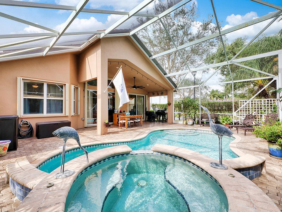 Welcome to your new home! This home has it all...Gourmet kitchen, stainless appliances, LARGE screened in pool area with hot tub, gorgeous flooring, granite counters, large corner lot located only steps away from luxurious clubhouse. Clubhouse is not only gorgeous but features a heated indoor pool, resort style outdoor pool, tons of activities, and more. Just a few steps in the other direction you're at the fitness center where you can play pickle-ball, tennis, and workout. Home has SOLAR panels so your average electric bill is only about $35 a month!! Air handler and pool heater 2 years old! New ceiling fans, NEST thermostat, smart home features allow you lock/unlock home remotely, and more! This home is near flawless and the furniture is negotiable! View it today!